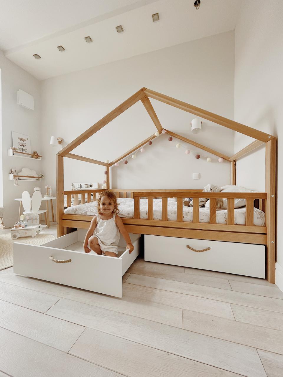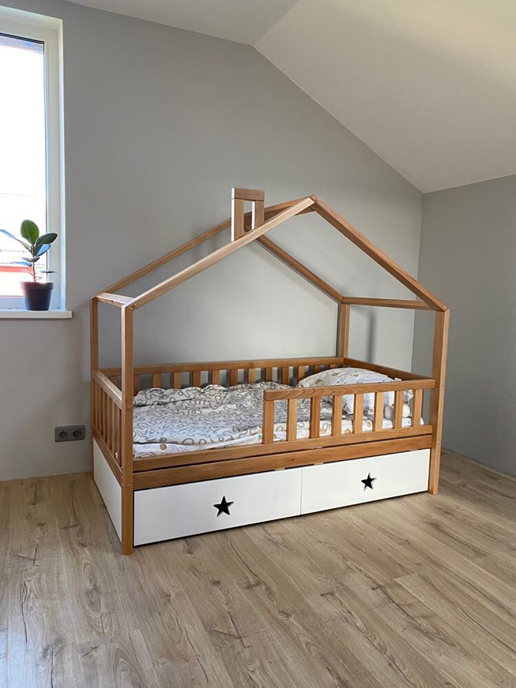 Экологичная кровать домик из массива бука является антисептиком, так как материал изготовления является живым деревом. Хорошо дополнит современный интерьер детской комнаты, особенно созданный дизайнером в скандинавском стиле.